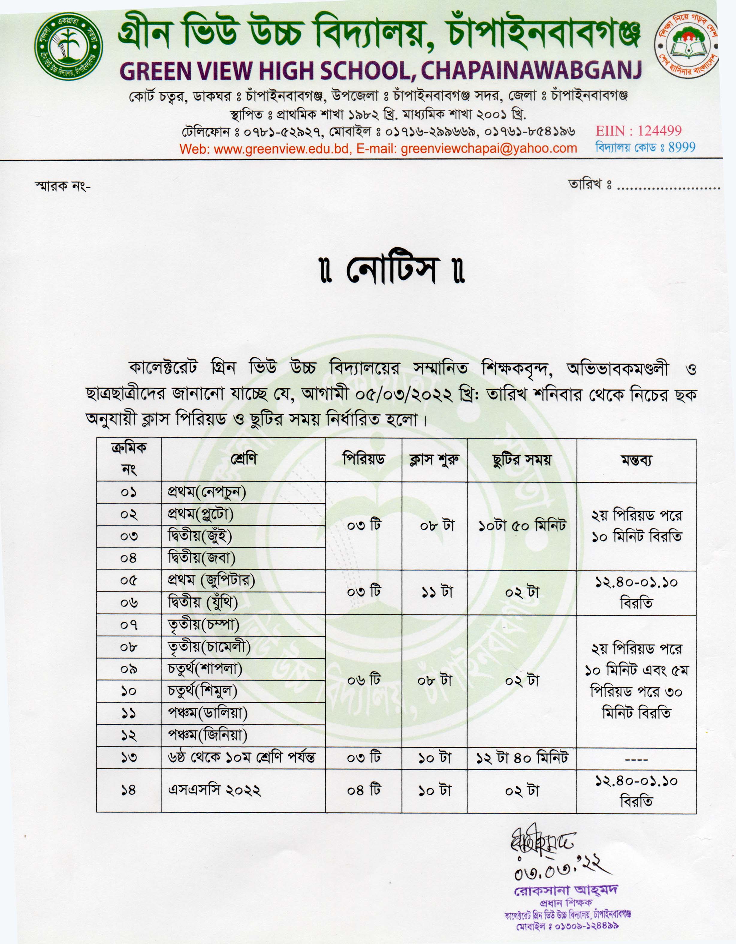 GVHS - ০৫.০৩.২০২২ খ্রি. তারিখ শনিবার থেকে ক্লাস পিরিয়ড ও ছুটির সময়